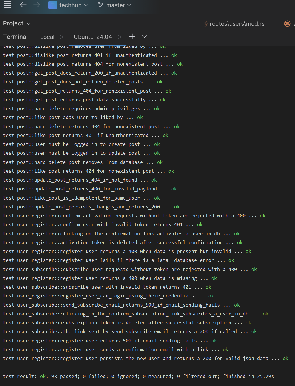 TechHub is a Rust-idiomatic, production-grade platform powered by Actix Web and PostgreSQL. Built with TDD and comprehensive property-based unit tests, fuzzing, and end-to-end black-box integration tests. Offers post creation with full-text search and pagination, comments, likes, and admin-driven newsletters to users powered by background workers for async and idempotent email delivery.